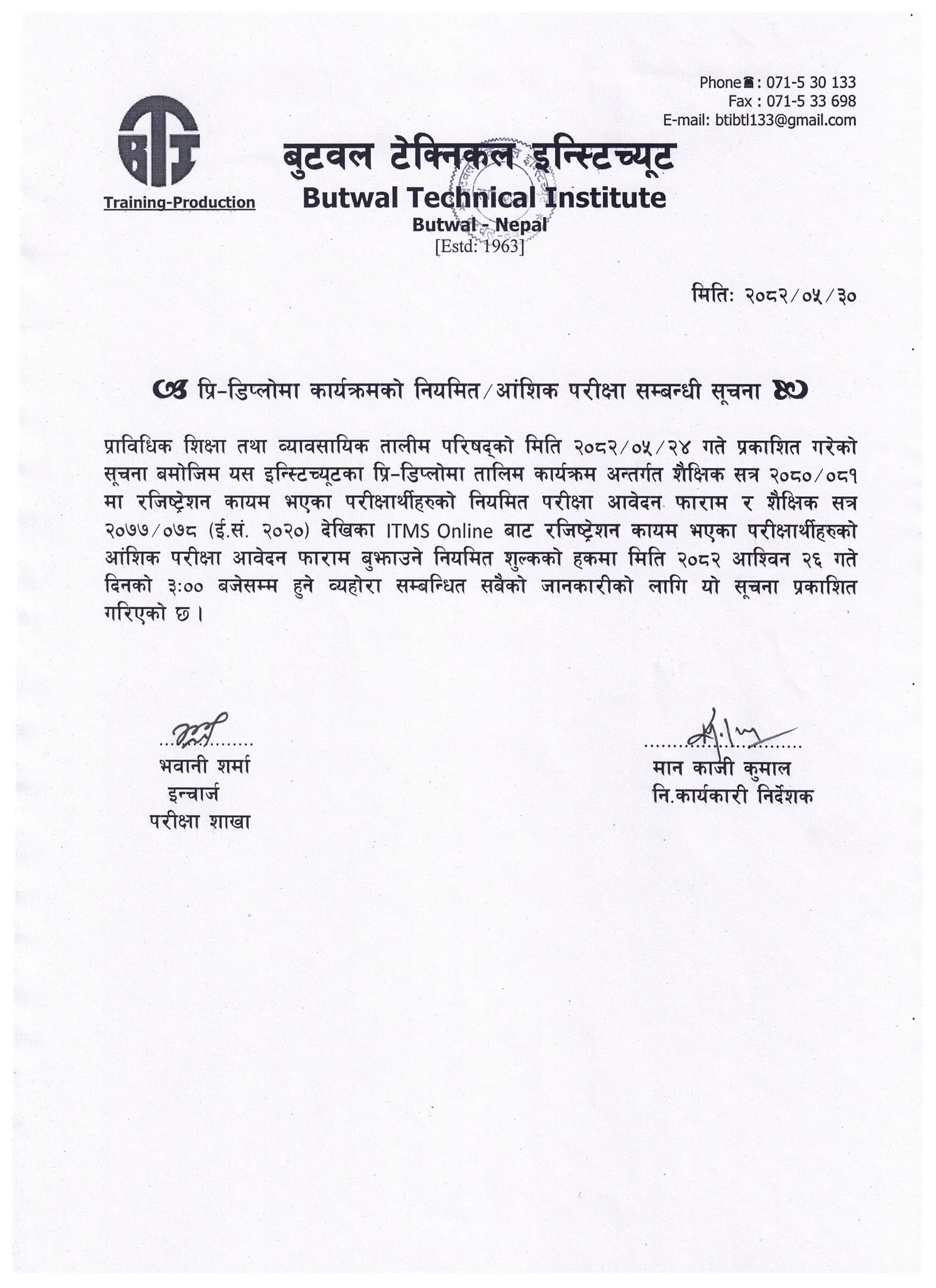 प्रि-डिप्लोमा नियमित तथा आंशिक परिक्षा सम्बन्धि सूचना । Posted by btiorg | Sep 15, 2025 | Uncategorized | 0 |