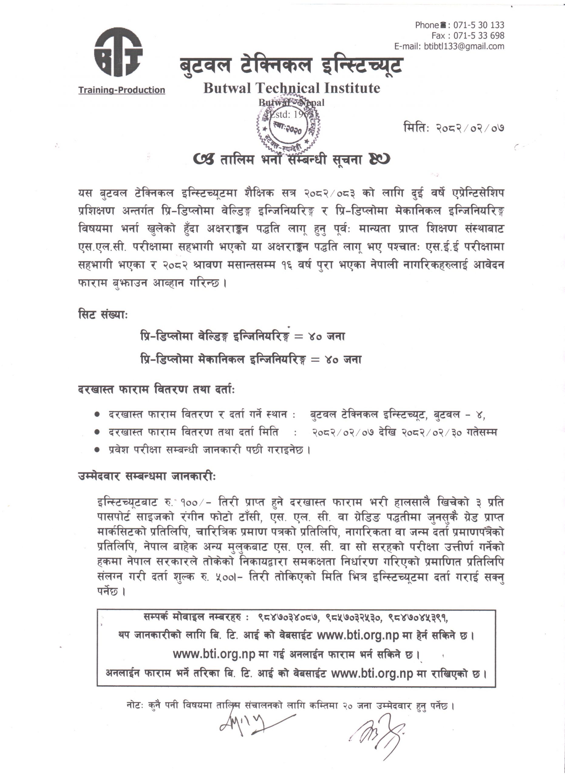 बि. टि. आइ. दुइ बर्षे प्रि-डिप्लोमा Apprenticeship तालिम भर्ना सम्बन्धी सूचना । Posted by btiorg | May 22, 2025 | Uncategorized | 0 |