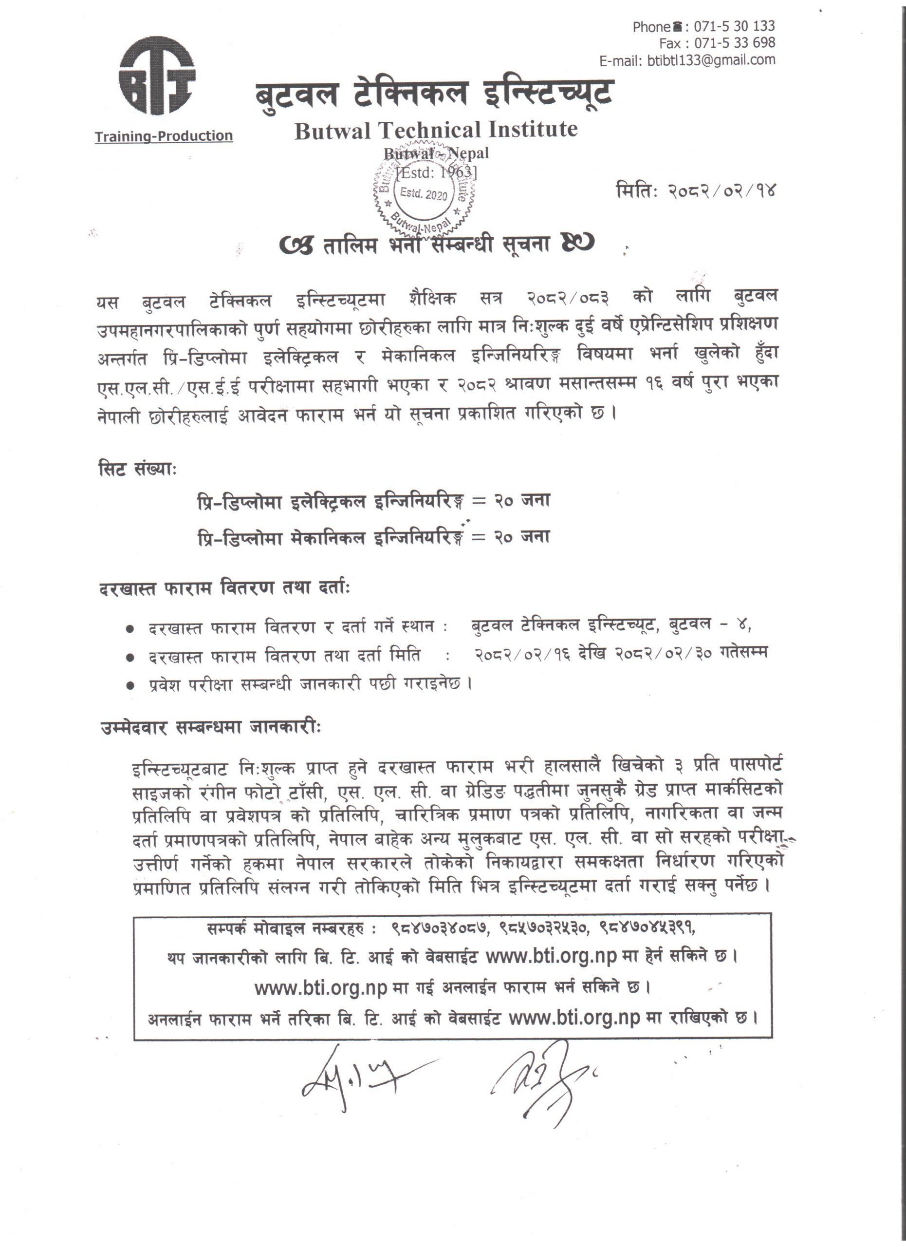 बि. टि. आई. २ बर्षे प्रि-डिप्लोमा निशुल्क छोरी पढाओं कार्यक्रम सम्बन्धी सूचना । Posted by btiorg | Jun 6, 2025 | Uncategorized | 0 | फाराम डाउनलोड गर्नुहोस्