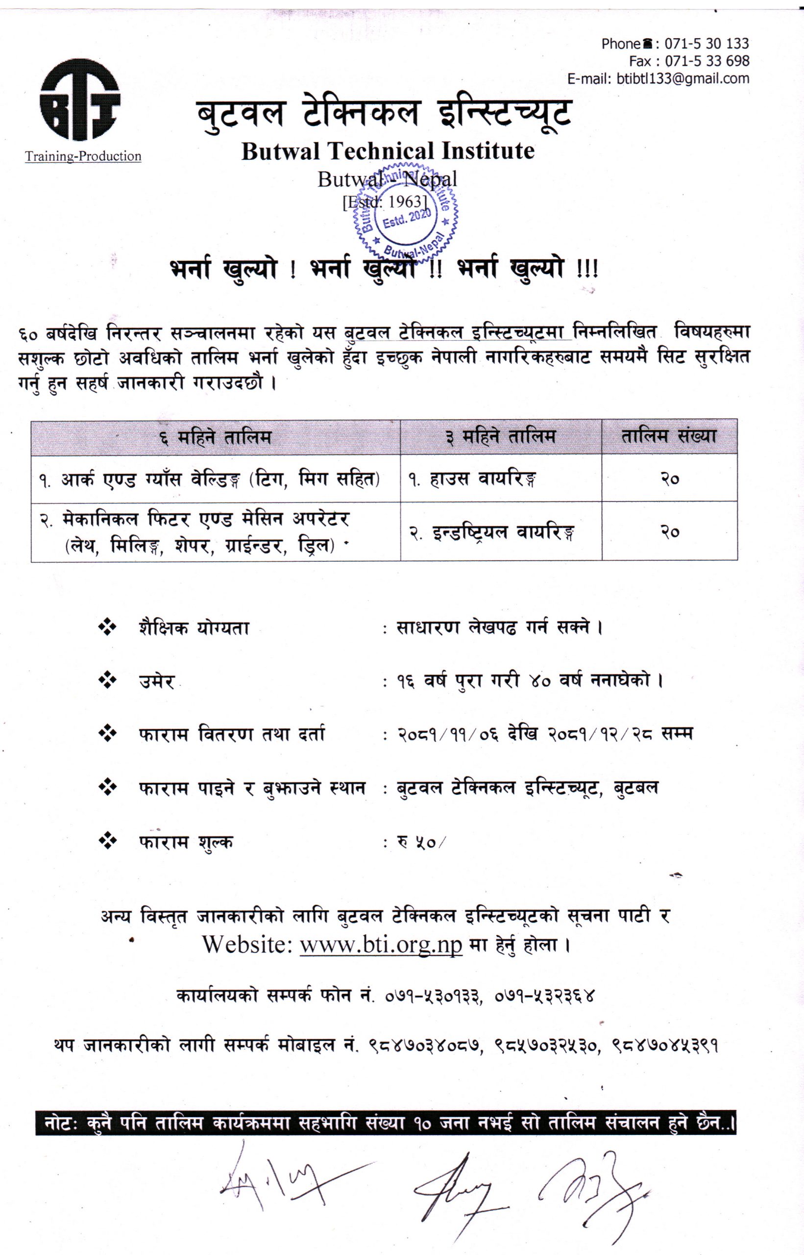 छोटो अवधिको तालिम भर्ना २०८१ को फाराम भर्ने सम्बन्धी सूचना । Posted by btiorg | Feb 18, 2025 | Uncategorized | 0 |