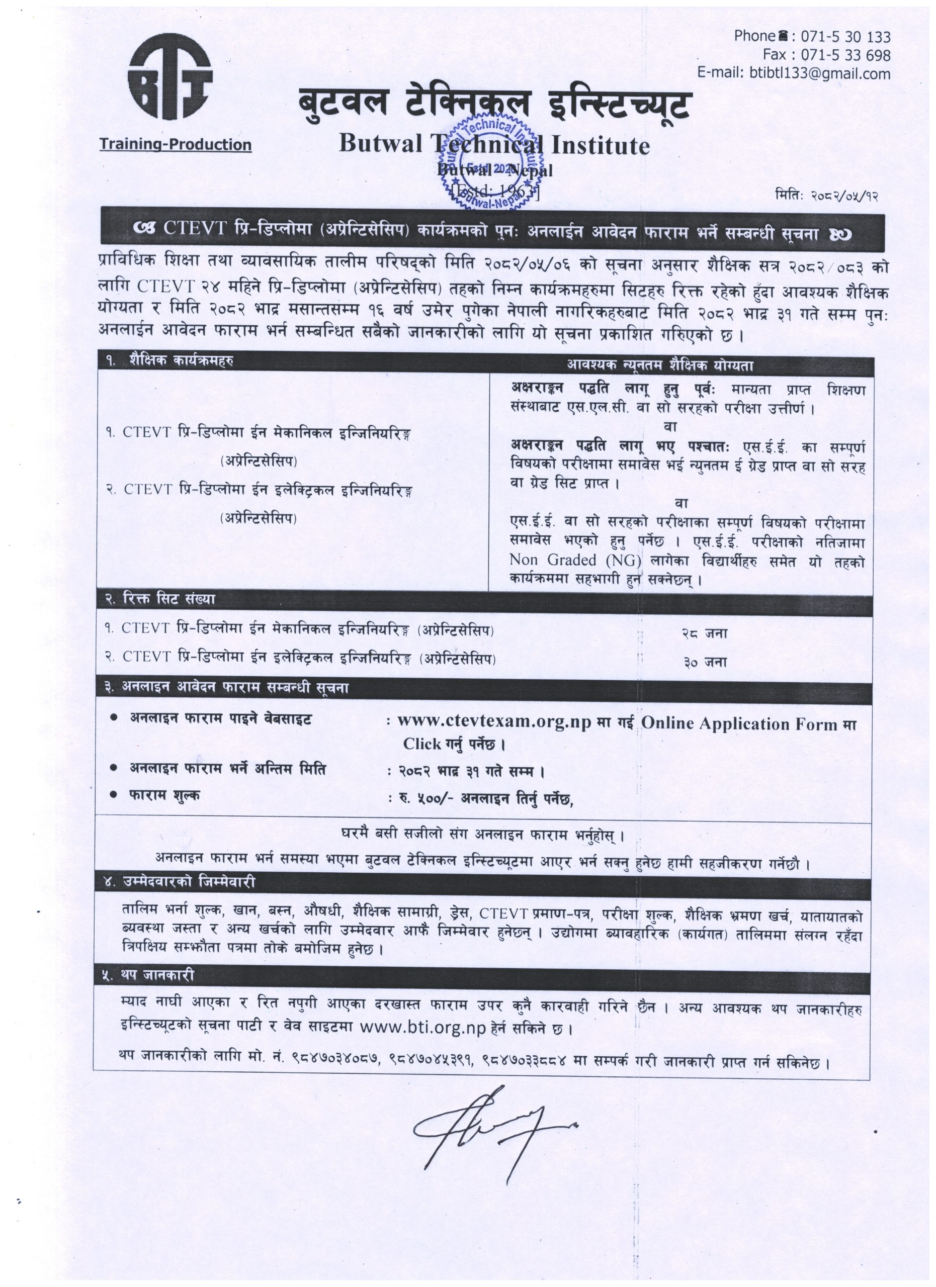 CTEVT प्रि-डिप्लोमा (अप्रेन्टिसेसिप) कार्यक्रम २०८२ को पुनः अनलाइन आवेदन फाराम भर्ने सम्बन्धि सूचना । Posted by btiorg | Aug 28, 2025 | Uncategorized | 0 |