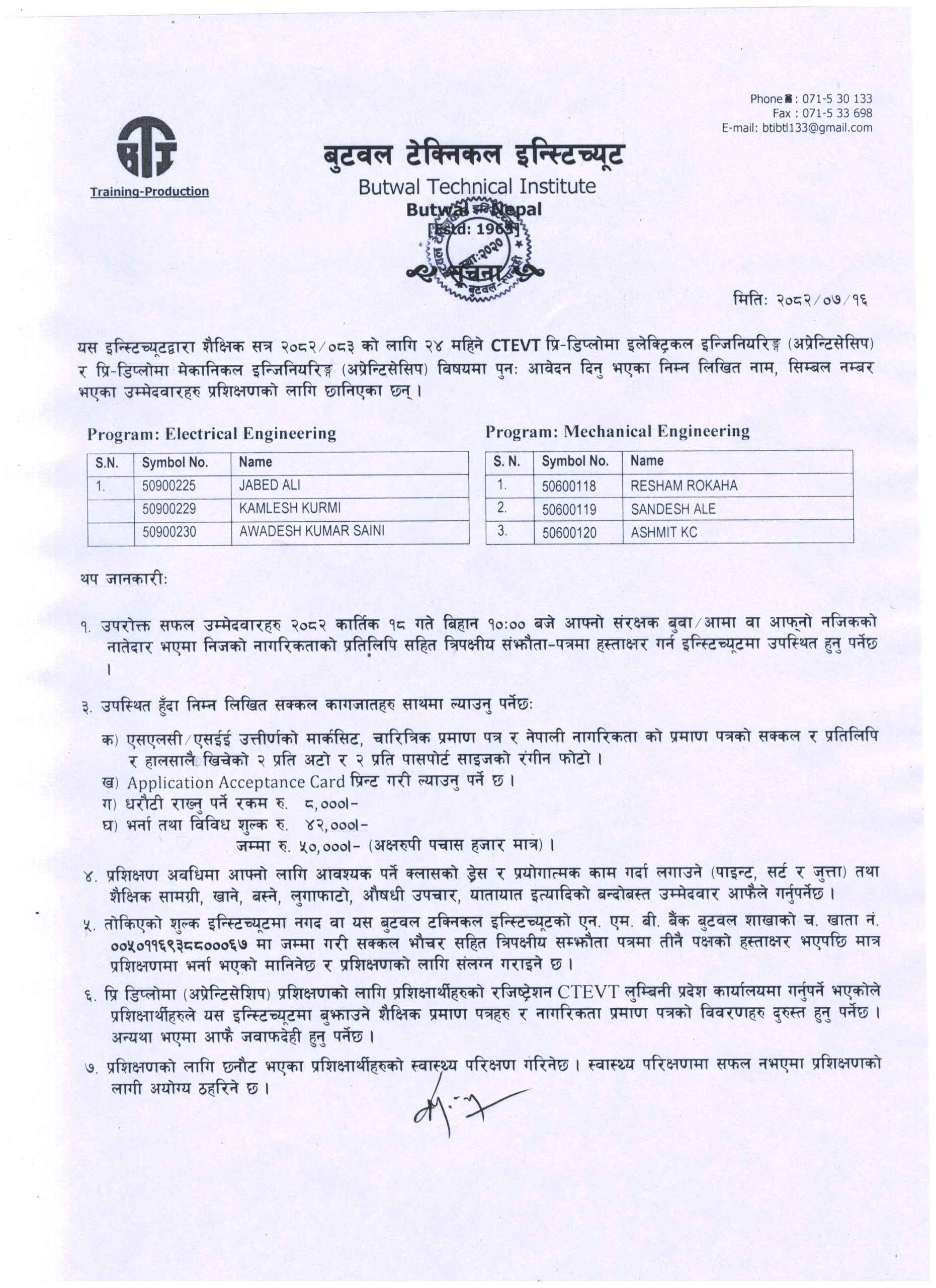 CTEVT प्रि-डिप्लोमा पुनः भर्ना नतिजा सम्बन्धि सूचना । Posted by btiorg | Nov 2, 2025 | Uncategorized | 0 |